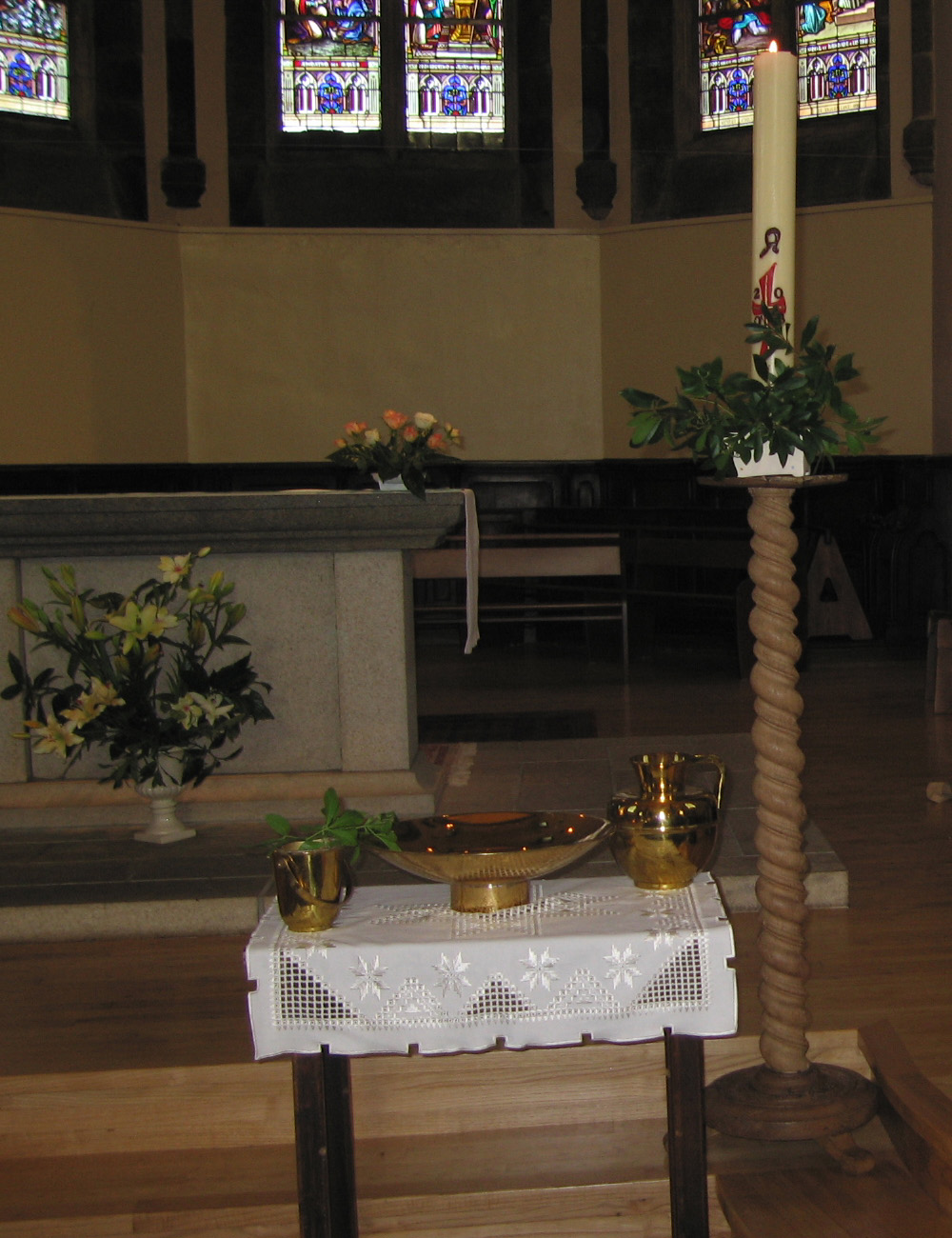 Les signes de l’eau et du cierge pascal nous rappellent notre propre baptême.