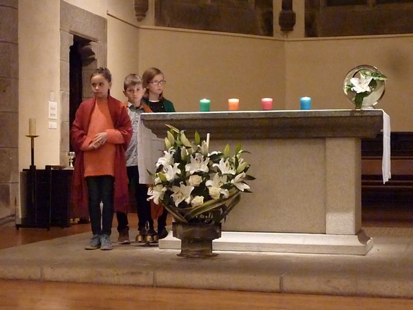 Un enfant prend le cierge, couleur orangée, posé sur l’autel et, en l’élevant, se place au centre du chœur, tourné vers l’assemblée