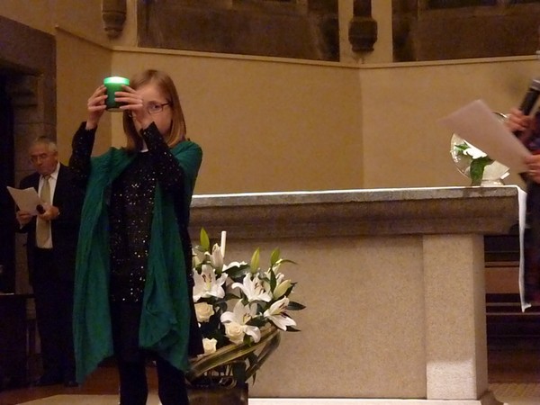 Un enfant prend le cierge, couleur bleue, posé sur l’autel et, en l’élevant, se place au centre du chœur, tourné vers l’assemblée