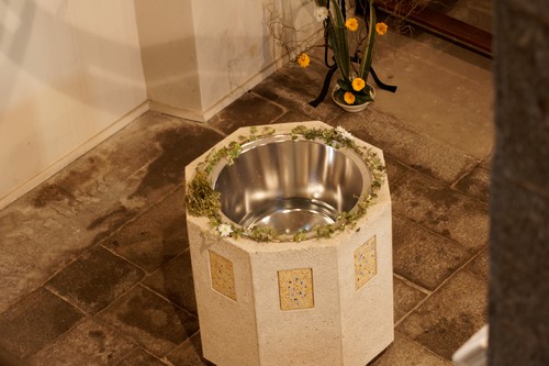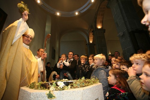 Venu célébrer au cours de la messe festive dominicale la bénédiction de notre nouveau baptistère, il eut l’occasion d’inaugurer celui-ci par un premier Baptême celui de Louis, entouré par tous les enfants ébahis d’assister en direct à cet événement solennel.