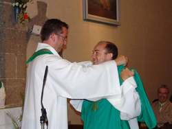 Ensuite Le père Hervé Le Vezouet a lu la lettre de nomination de Laurent écrite par notre évêque Lucien Fruchaud, puis lui a passé (non sans mal) sa chasuble, symbole de la fonction.