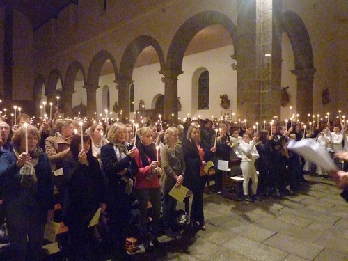 En remontant la nef, le cierge pascal multiplie les porteurs de lumière à toute l’assemblée.