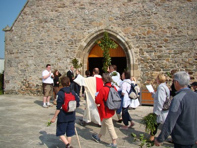 Le petit port de St Guimond nous tend les bras et c’est le lavement des pieds ensablés avant de prendre la direction du parking du cimetière où a lieu la bénédiction des rameaux par Laurent notre curé.