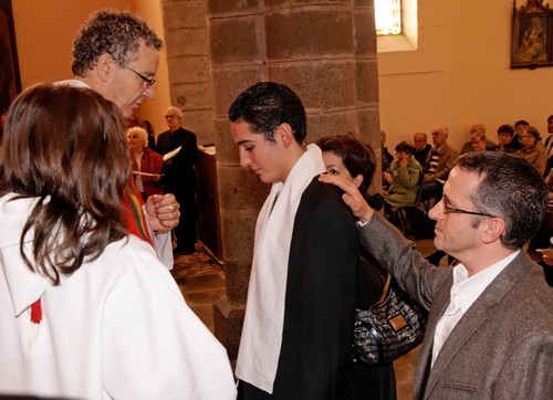 Au début de la Célébration, chaque confirmand est appelé par son prénom et reçoit le vêtement blanc, une écharpe brodée à son prénom.