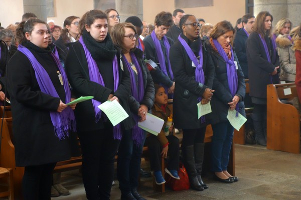 Après avoir signé, pendant le chant, les catéchumènes se présentent devant l’évêque en arc de cercle. Ils s’avancent d’un pas chacun leur tour, Mgr D Moutel leur remet une écharpe violette, et adresse quelques mots à chacun.