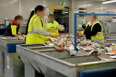 Des salarié.e.s complètent le tri, en fin de chaîne.