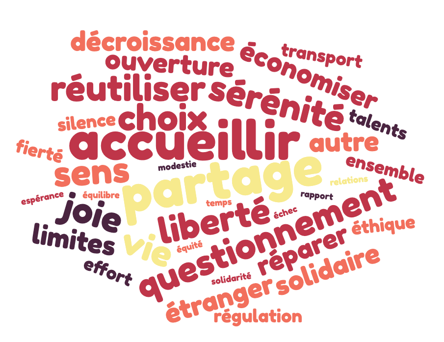 La rencontre s’est conclue par la mise en commun des échanges au moyen de mots-clés : sobriété heureuse, intendant, partage, simplicité, liberté, sérénité, questionnement, choix, sens, accueillir, vie, joie, réutiliser, économiser, réparer, solidaire, accueillir l’étranger, ouverture à l’autre, décroissance, limites, ensemble, silence, talents, effort, fierté, éthique, régulation, transport, modestie, rapport au temps, échec, partage, solidarité, relations, solidarité, équilibre, équité, espérance.